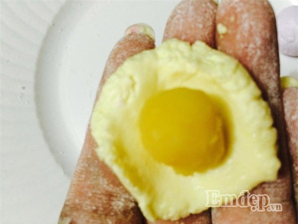 Lấy lượng bột vừa phải, cho nhân đậu xanh xào dừa đã chuẩn bị ở trên vào, vê kín và ấn thành bánh hơi dẹt, hình vuông hoặc chữ nhật.