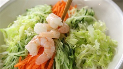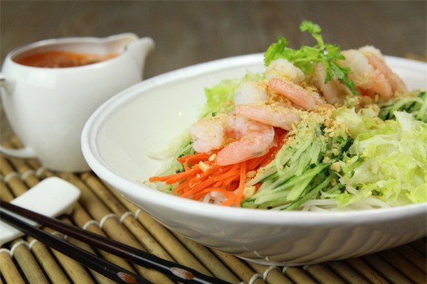 rốt, rau bắp cải xung quanh vành đĩa. Chính giữa xếp tôm và lá rau mùi