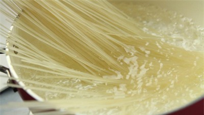 sôi một nồi nước nóng, cho bún gạo khô vào luộc sơ cho đến khi sợi bún