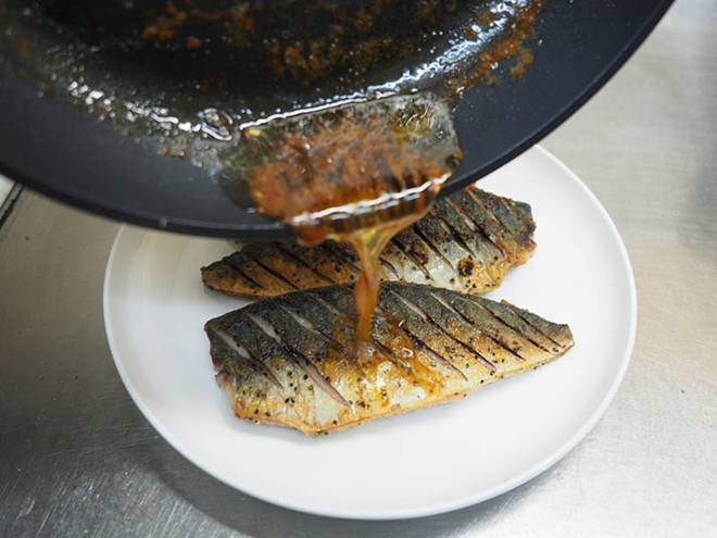 Cuối cùng rưới nước sốt lên cá thu, trang trí thêm bông cải xanh và cà chua.