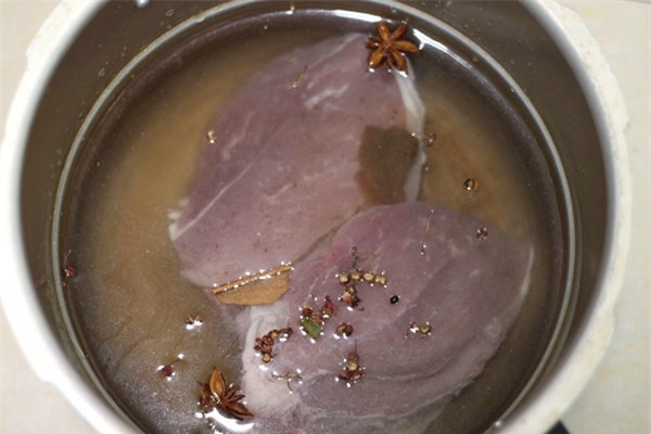 Thịt nạc heo mua về rửa sạch, sau đó cho vào nồi áp suất luộc cùng với lá nguyệt quế, hạt tiêu và hoa hồi trong vòng 15 phút.