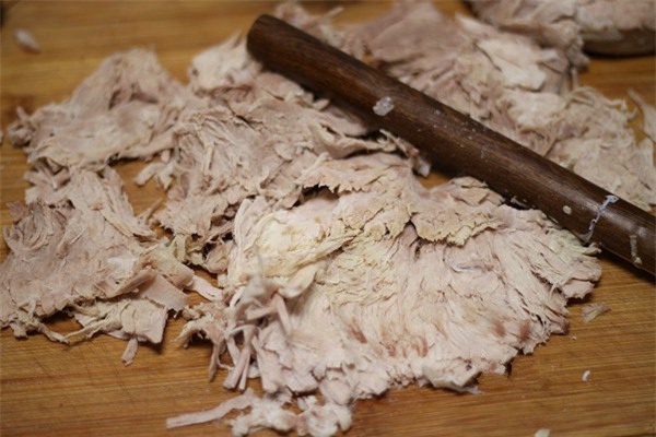 Thịt lúc này đã chín mềm, bạn vớt ra và dùng chày giã thịt cho tơi ra.