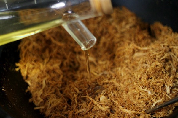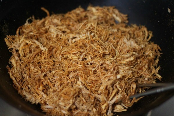Dùng tay xé tơi thịt hơn nữa rồi cho vào chảo cùng với nước mắm, ngũ vị hương, đường, ớt bột, muối, rượu vang trắng vào đảo trên lửa nhỏ.