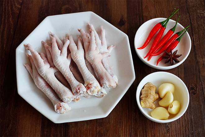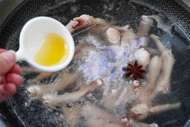Đun sôi nước rồi cho chân gà vào, thêm gừng thái lát và hoa hồi để nước thơm hơn; có thể thêm một thìa rượu nấu ăn, sau đó dùng nước này chần chân gà trong 10 phút.