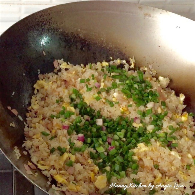 Cuối cùng rắc hành lá vào, đảo cho tới khi hành chín, nêm nếm cho vừa miệng thì tắt bếp.