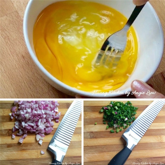 Trứng đánh tan, cho một chút xíu muối vào đánh cùng. Hành lá, hành tây rửa sạch thái nhỏ.