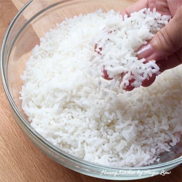 Rửa tay thật sạch, làm ướt tay sau đó đảo cơm để các hạt cơm được bao 1 lớp nước nhỏ, hạt cơm được ẩm và tơi.