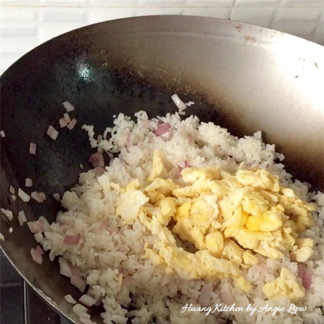 Vẫn trong chảo đó, cho chút dầu ăn vào sau đó cho cơm vào rang.