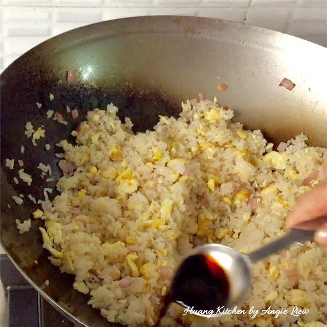 Rưới chút bột hạt tiêu, 1 chút muối và 1 thìa súp nước tương vào. Đảo đều lên.