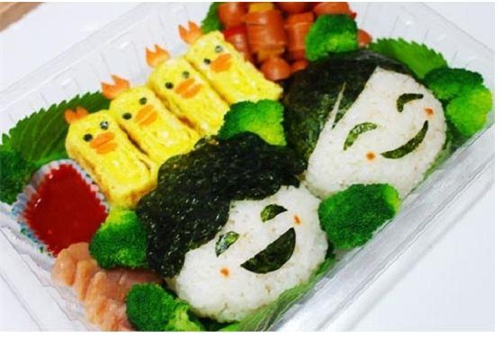 – Dùng tương ớt, rong biể cắt thành mắt, mũi, miệng.. rồi trang trí lên trên 2 nắm cơm sao cho thật đáng yêu.