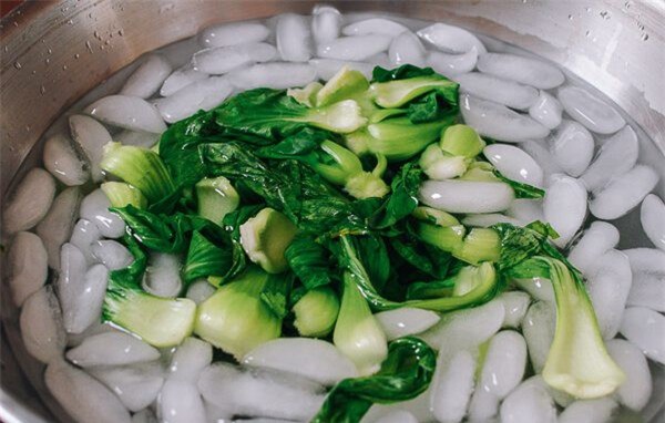 Cải thìa rửa sạch, đun 1 nồi nước luộc sơ khoảng 2 phút sau đó vớt sang chậu nước đá.