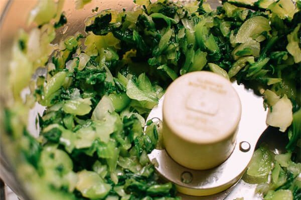 Vắt ráo nước rồi thái nhỏ hoặc cho vào máy, xay nhỏ. Cà rốt, nấm hương rửa sạch, thái miếng nhỏ rồi chần qua với nước sôi sau đó cũng cho sang bát nước đá cho nguội rồi thái nhỏ hoặc xay nhỏ.