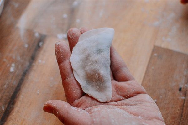 Cán bột thành từng miếng tròn rồi đặt nhân vào giữa, dính mép bột lại thành hình bán nguyệt.