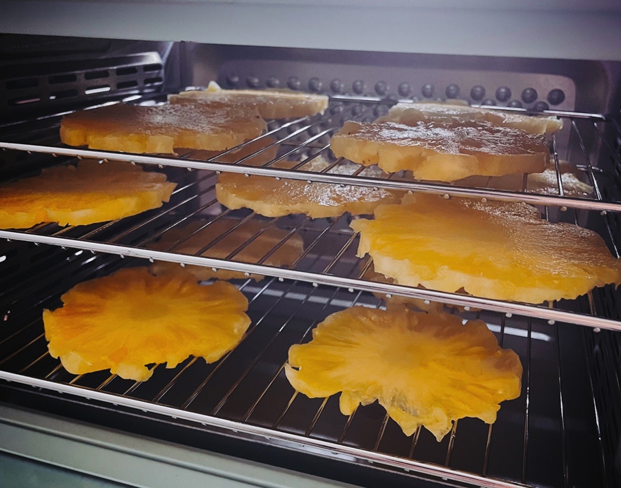 Đặt vỉ dứa vào lò nướng, sấy ở nhiệt độ thấp nhất 70 độ C trong 8h là được (hoặc cho đến khi dứa khô).
