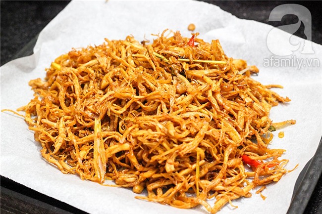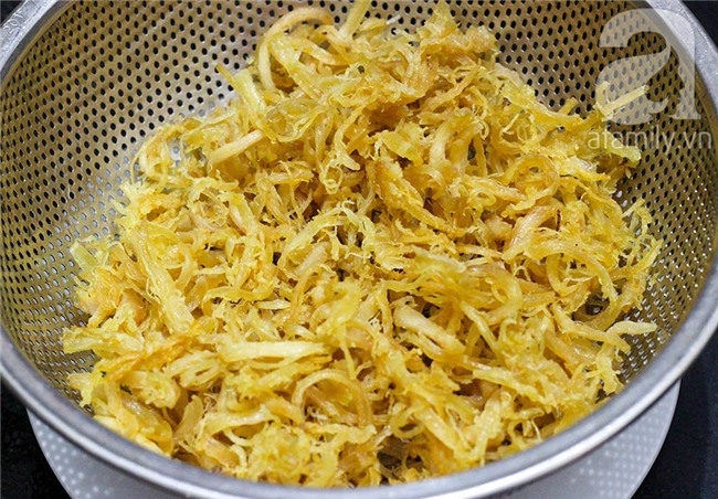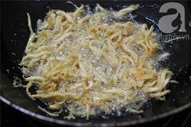 Khi sợi gà chuyển màu hơi vàng bạn vớt gà ra rổ cho ráo dầu.