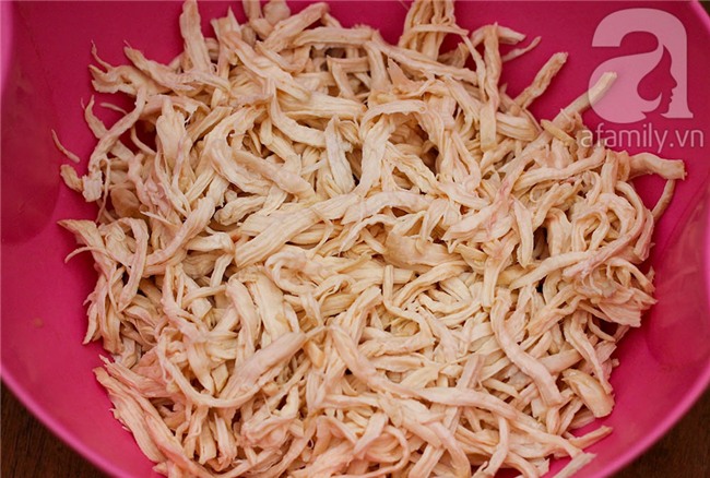 Xé thịt gà theo thớ dài, xé sợi thịt gà không nên xé quá nhỏ sẽ khiến gà bị khô.