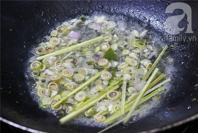 Đổ 100ml nước luộc gà vào chảo, thêm tỏi, sả, hành khô băm nhỏ vào.