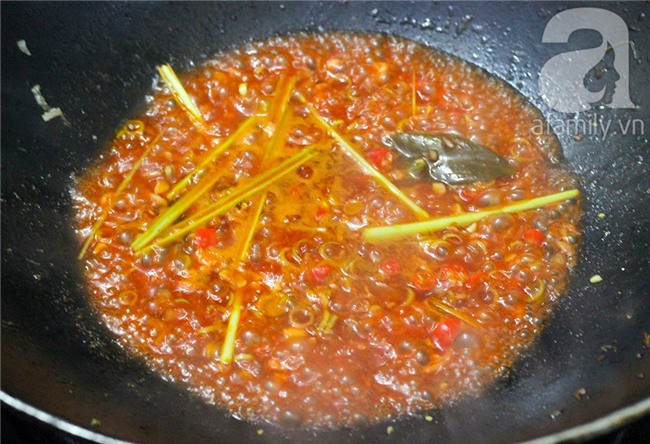 Tiếp theo, bạn cho nước mắm, đường, ớt bột, bột màu điều vào chảo khuấy đều.