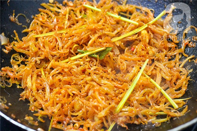 Khi nước gần cạn hết, bạn vặn lửa nhỏ, thêm ngũ vị hương vào và tiếp tục đảo đều tay đến khi sợi gà ráo nước.