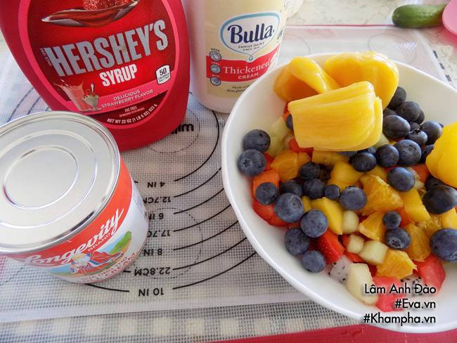 Bước 4: Sau đó cho trái cây, cuối cùng là hỗn hợp sữa chua phủ đầy.