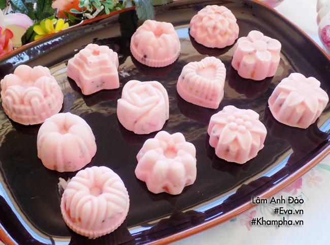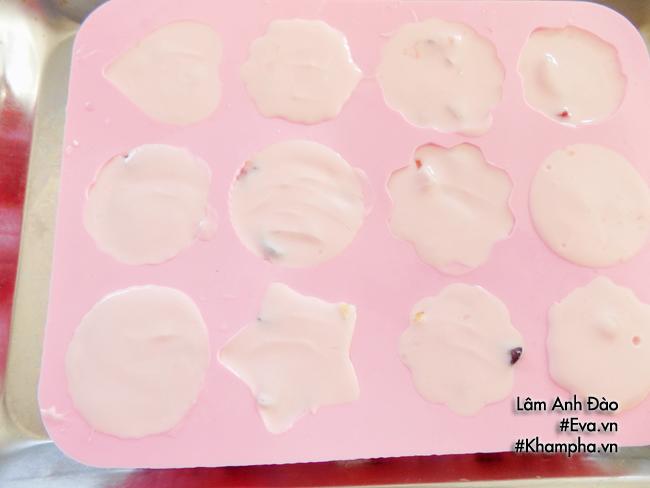 Cho khuôn kem sữa chua vào ngăn đá tủ lạnh 6-7 tiếng là có thể lấy ra thưởng thức.