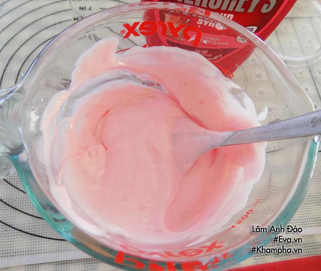 Bước 3: Cho ít sữa chua vị dâu vào khay/ khuôn nhựa. Nếu có khuôn que đều được.