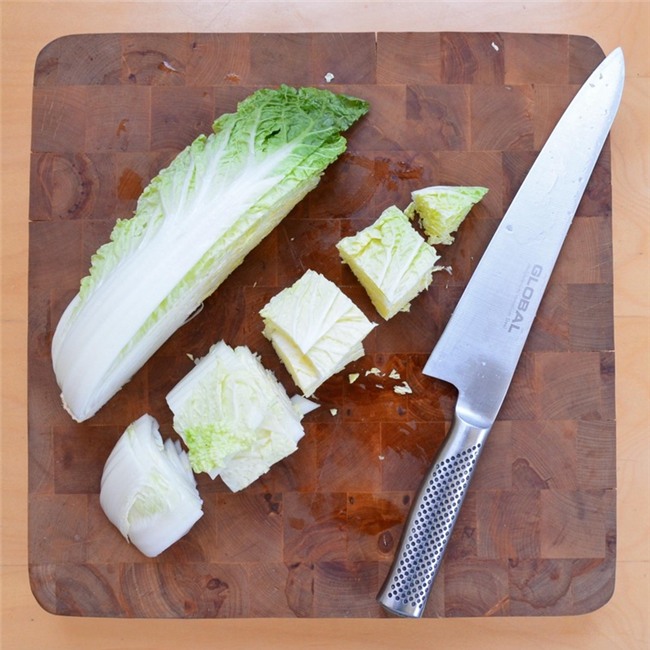 Cắt cải thảo theo chiều dọc làm tư, bỏ lõi. Rồi cắt ngang lại có độ dài khoảng 2-3cm.