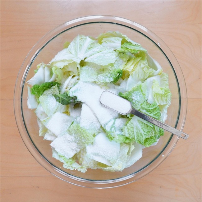 Cho cải thảo và muối trong một bát lớn. Đeo găng tay vào rồi bóp muối vào cải thảo cho đến khi cải mềm một chút, sau đó thêm nước vào ngập mặt cải thảo. Đặt một tấm thớt lên mặt đè cải xuống, để yên trong 1-2 giờ.
