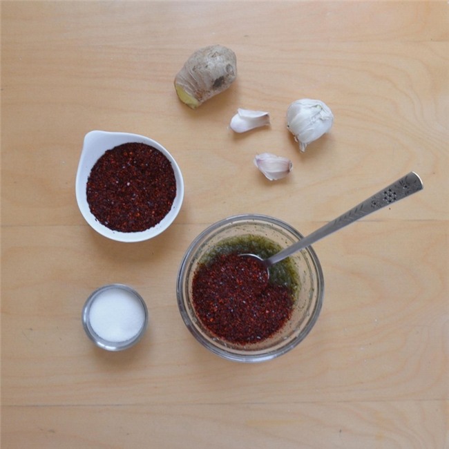 Trộn tỏi, gừng, đường, hạt nêm, nước và ớt trong một bát nhỏ. Trộn cho đến khi tạo thành hỗn hợp đồng nhất. Nếu thích cay hơn thì cho thêm ớt bột vào.