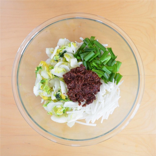 Nhẹ nhàng vắt cải thảo lần nữa cho sạch nước rồi cho vào một tô trộn lớn kế tiếp cho củ cải, hành lá, hỗn hợp gia vị ớt vừa trộn ở trên vào.