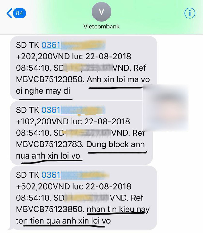Thay vì viết nội dung chuyển khoản kiểu truyền thống như: "Chi lương, trả nợ, trả tiền..." hay gì đó thì anh chồng lại viết xin lỗi vợ cực dễ thương qua dòng chữ ngắn ngủi: "Anh xin lỗi mà vợ ơi nghe máy đi"; "Đừng block anh nữa, anh xin lỗi vợ": "Nhắn tin kiểu này tốn tiền quá, anh xin lỗi vợ"... Cứ mỗi lần như vậy, là số tiền 100 nghìn, 200 nghìn, thậm chí 500 nghìn lần lượt được chuyển vào tài khoản của cô vợ.