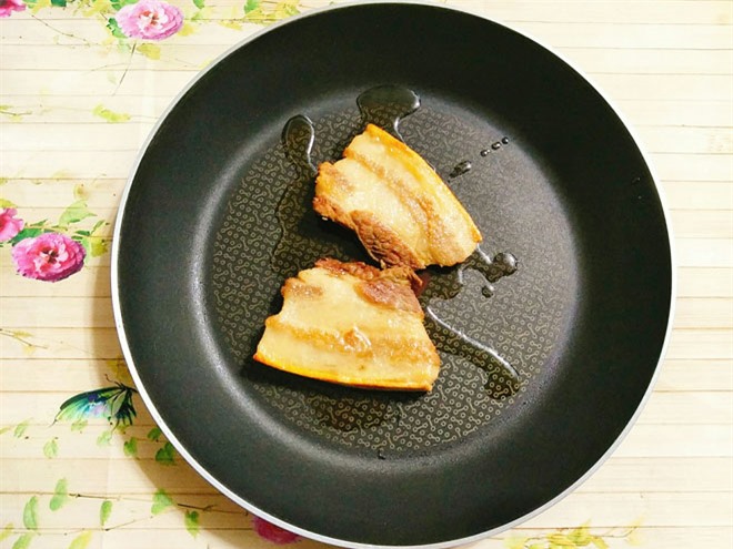 Đặt chảo lên bếp cùng với dầu ăn, đun cho nóng dầu thì cho thịt ba chỉ vào chiên phần bì trước, khi bì heo đã vàng giòn mới chiên tiếp 2 mặt miếng thịt tới khi thịt chín vàng là được.