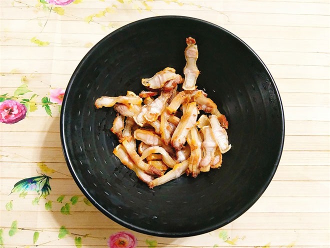 Gắp thịt ba chỉ ra thớt để cho nguội bớt và thái miếng mỏng cho vào tô.
