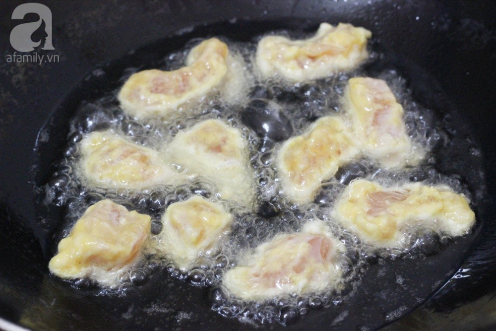 Đổ dầu vào chảo sâu lòng, khi dầu sôi bạn thả từng miếng gà vào chiên.