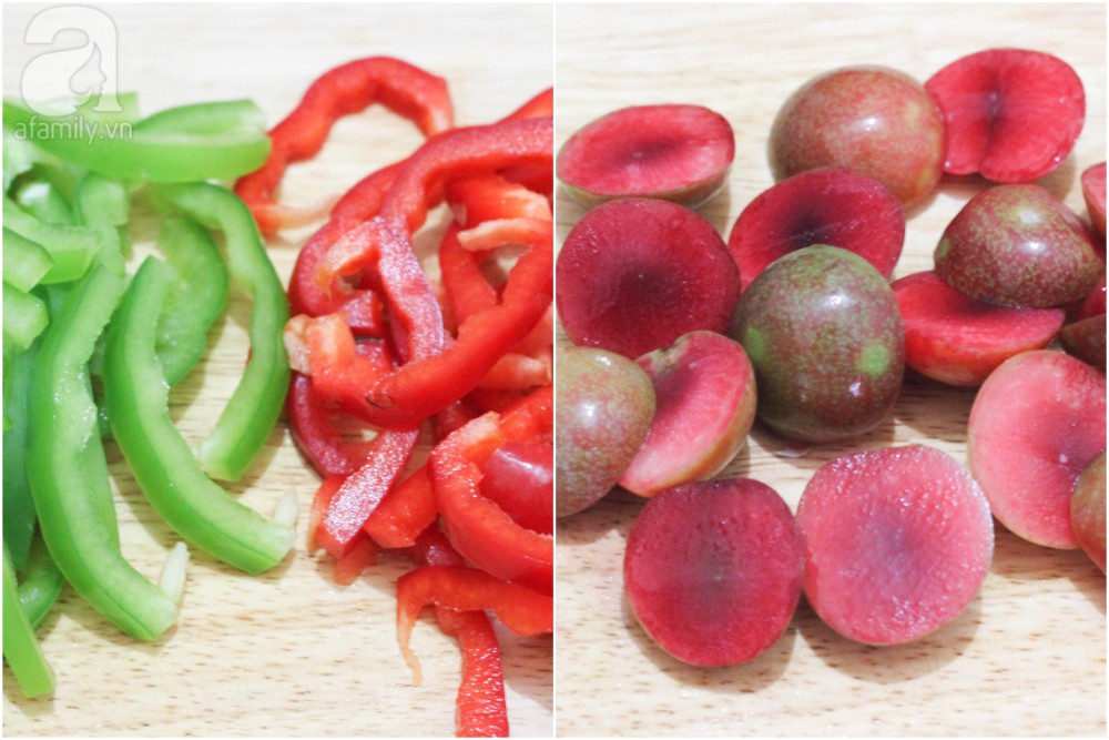 Ớt chuông rửa sạch, thái sợi nhỏ. Mận cắt miếng, bỏ hạt.