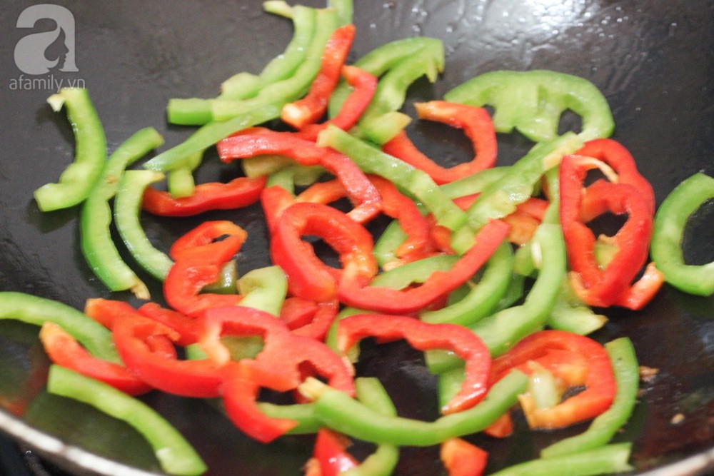 Đổ chút dầu ăn vào chảo, cho ớt chuông vào xào khoảng 3 phút.