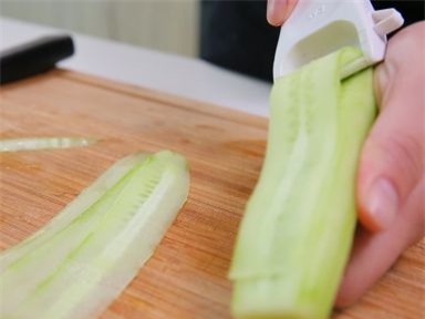 Dưa chuột gọt vỏ, dùng nạo thái lát mỏng.