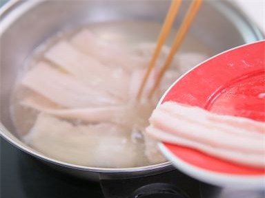 Thả thịt lợn đã rửa sạch thái lát mỏng vào nồi nước. Nếu bạn muốn thái thịt lát mỏng dễ dàng hãy để thịt vào ngăn đông cho thịt cứng lại rồi thái, hoặc mua thịt thái sẵn ở siêu thị.