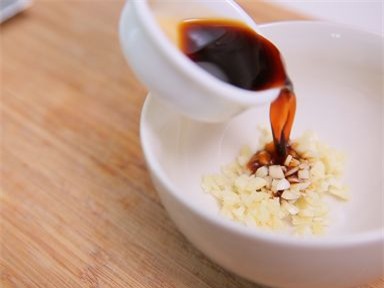 Cho nước tương, tỏi, dầu mè, sa tế, đường vào, trộn đều lên.