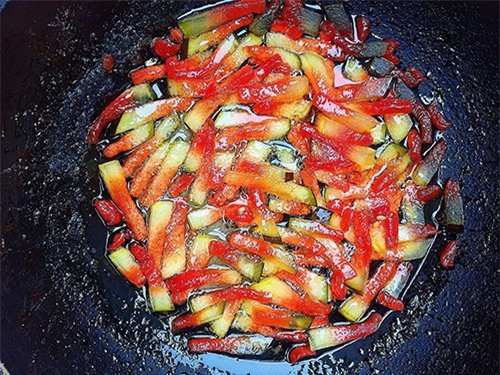 - Chắt lại phần nước đường tiết ra, cho dưa lên chảo sên với lửa vừa để dưa tiết ra nước, sau đó đổ bỏ phần nước này đi.