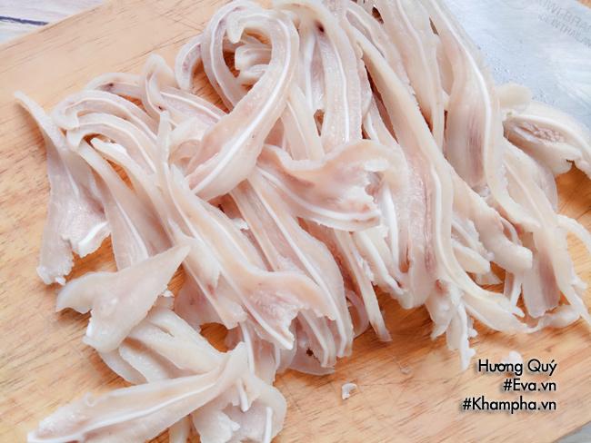 Bước 1: Chuẩn bị 2 lít với 3 thìa nước cốt chanh (cách này sẽ giúp hoa chuối không bị thâm trong khi thái). Hoa chuối sau khi mua bóc bỏ lớp bẹ già bên ngoài, sau đó bóc lớp bẹ non đem rửa sạch. Dùng dao sắc thái hoa chuối thành những lát thật mỏng, thái được bao nhiêu thì cho vào chậu nước ngâm ngay.