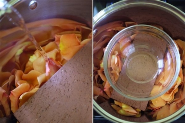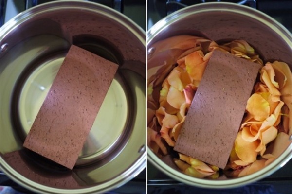 Cho nồi lên bếp và đặt viên gạch vào trong nồi. Xếp các cánh hoa hồng xung quanh viên gạch cho đến khi phủ đầy trong nồi.