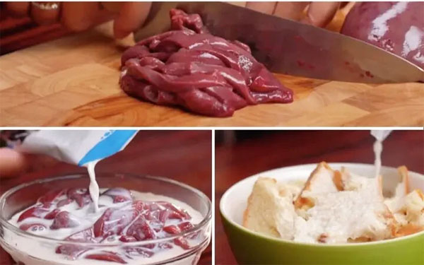 Gan bạn mua về rửa sạch, cắt thành miếng nhỏ sau đó ngâm vào 150ml sữa tươi (hoạc giấm, nước muối loãng) để làm sạch gan, không bám mùi. Khi mua bạn lựa miếng gan tươi, đều màu, có màu đỏ hoặc hồng tươi, không nên chọn gan màu sẫm hoặc ngả vàng vì đó là những lá gan không tươi hoặc bệnh. Phần sữa còn lại các bạn cho vào bánh mì sandwich xé nhỏ.