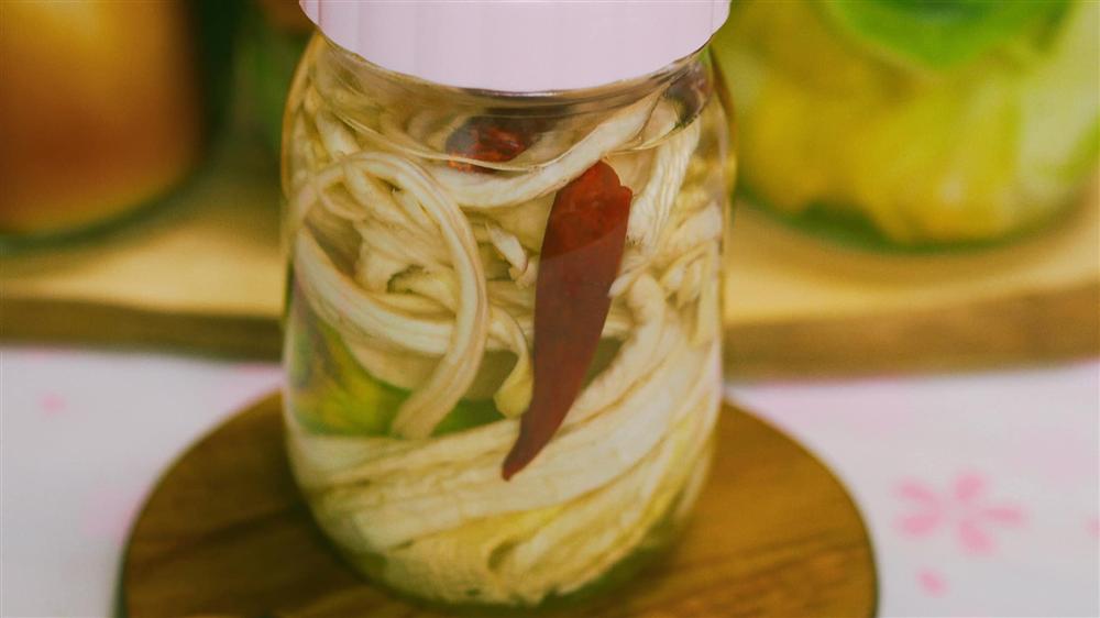 - Củ cải khô ngâm nước ấm cho bớt mặn rồi vắt kiệt, cho củ cải vào hũ sạch, đổ nước giấm chua ngọt vào ngập củ cải. Thêm vào vài quả ớt.