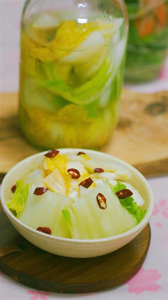 - Xếp cải thảo vào hũ sạch, thêm mấy quả ớt vào, đổ nước muối ngập cải thảo.