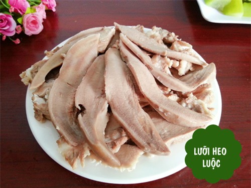 3. Sau đó, vớt lưỡi heo ra cho ráo nước. Thái lưỡi heo thành những miếng mỏng, xếp thành đĩa. Chấm với mắm chanh hoặc xì dầu thêm tỏi ớt.