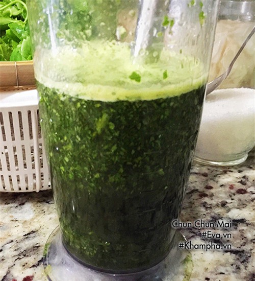 Bước 2: Cắt nhỏ rau má sau đó cho vào máy xay cùng chút nước đun sôi để nguội xay nhỏ, sau đó cho rau má đã xay ra 1 tô lớn, tiếp tục xay cho đến khi hết. Lượng nước nhiều ít tùy theo độ đậm đặc mà bạn muốn. Sau khi xay nhỏ cho qua rây lọc lấy phần nước cốt, để tủ lạnh cho mát.