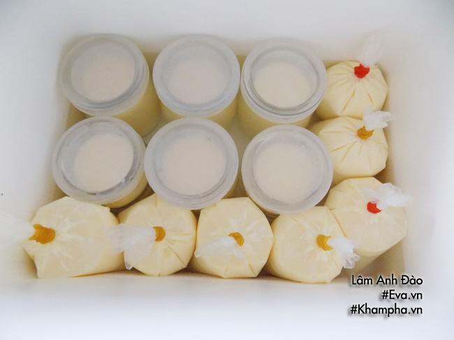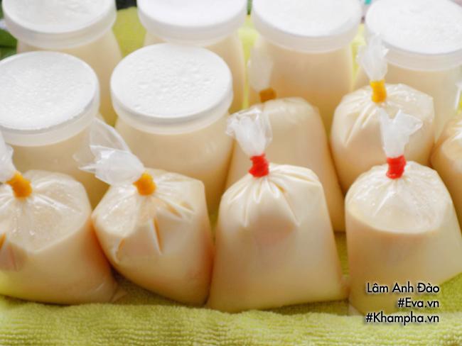 Bước 6: Đổ sữa vào từng túi nhỏ hoặc hộp nhỏ (loại thủy tinh hay nhựa đều được) hay bịch nhỏ. Nếu là túi, sau khi đổ xong, buộc dây chun cho chặt.
