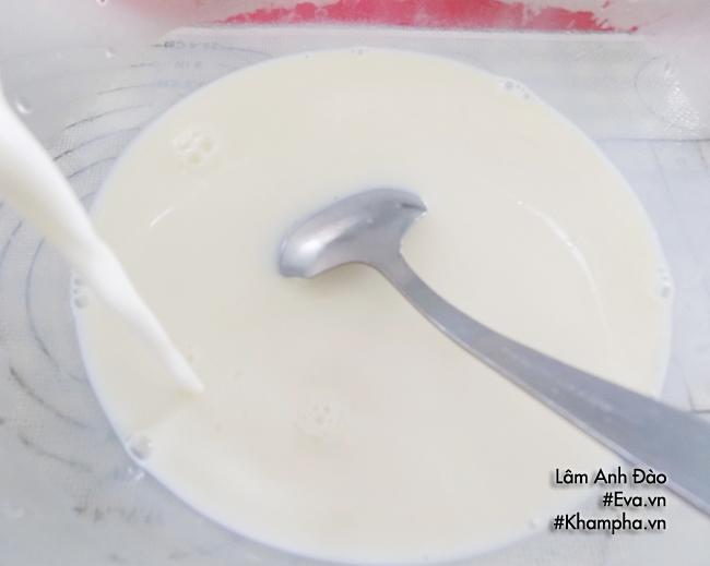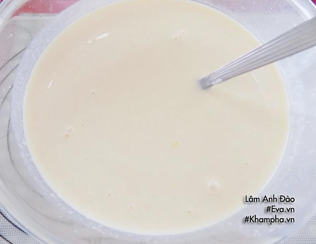 Bước 3: Tiếp theo đong 2 lon sữa tươi cho vào cũng nhẹ nhàng khuấy đều (nhớ khuấy 1 chiều nhé).