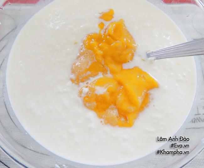 Bước 4: Cuối cùng cho hộp sữa chua cái đã khuấy mịn và xoài xay nhuyễn vào tiếp tục khuấy nhẹ cho tất cả hòa vào nhau.